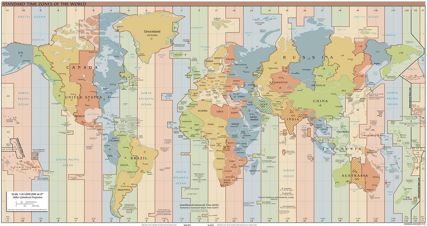 In our modern world, the response to that question is fairly straightforward; you can simply check your phone, which displays the time sent to it via cell towers. The time you see on your screen is synchronized to an atomic clock and adjusted based on the time zone in which you live. Time zones, however, are a relatively recent human invention, so how did people respond to this question before time zones? And if human civilization was able to carry on just fine without time zones for millennia, what prompted us to implement this strange, and sometimes confusing system? Today, we explore the history of time zones and humanity’s attempt to organize time.
